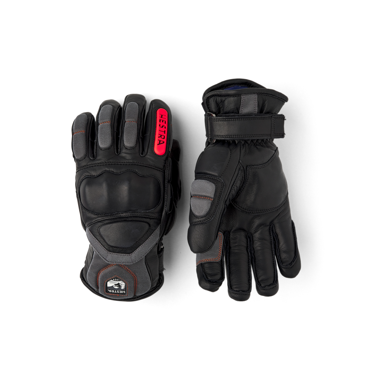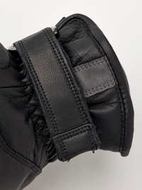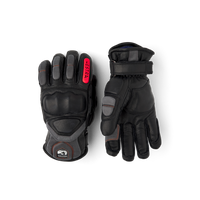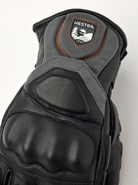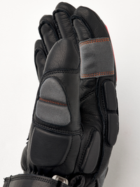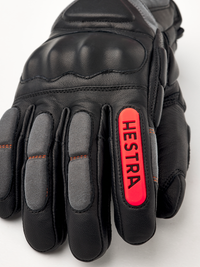 Black ski glove with gray and red goat leather details and synthetic suede palm